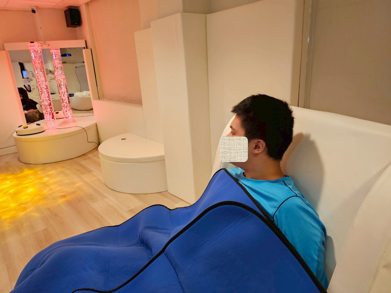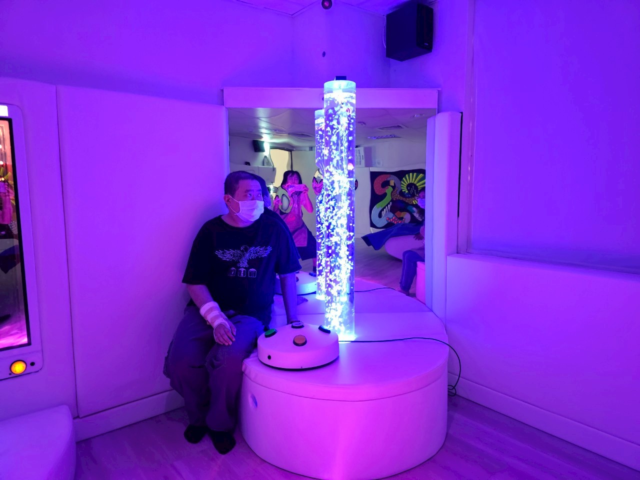 小佑第一個發現水族魚泡泡管的變化,他靜靜地坐著,凝望著那像海洋般的藍色光芒,彷彿整個人也隨之沉浸在溫柔的海浪裡。另一邊,小芸抱著重量毯復蓋著,感覺像媽媽的擁抱,讓他好安心。阿宏則選擇了搖椅,他來回晃動著,嘴角不自覺地揚起笑容,每一次擺盪彷彿都帶走了他心中的不安。