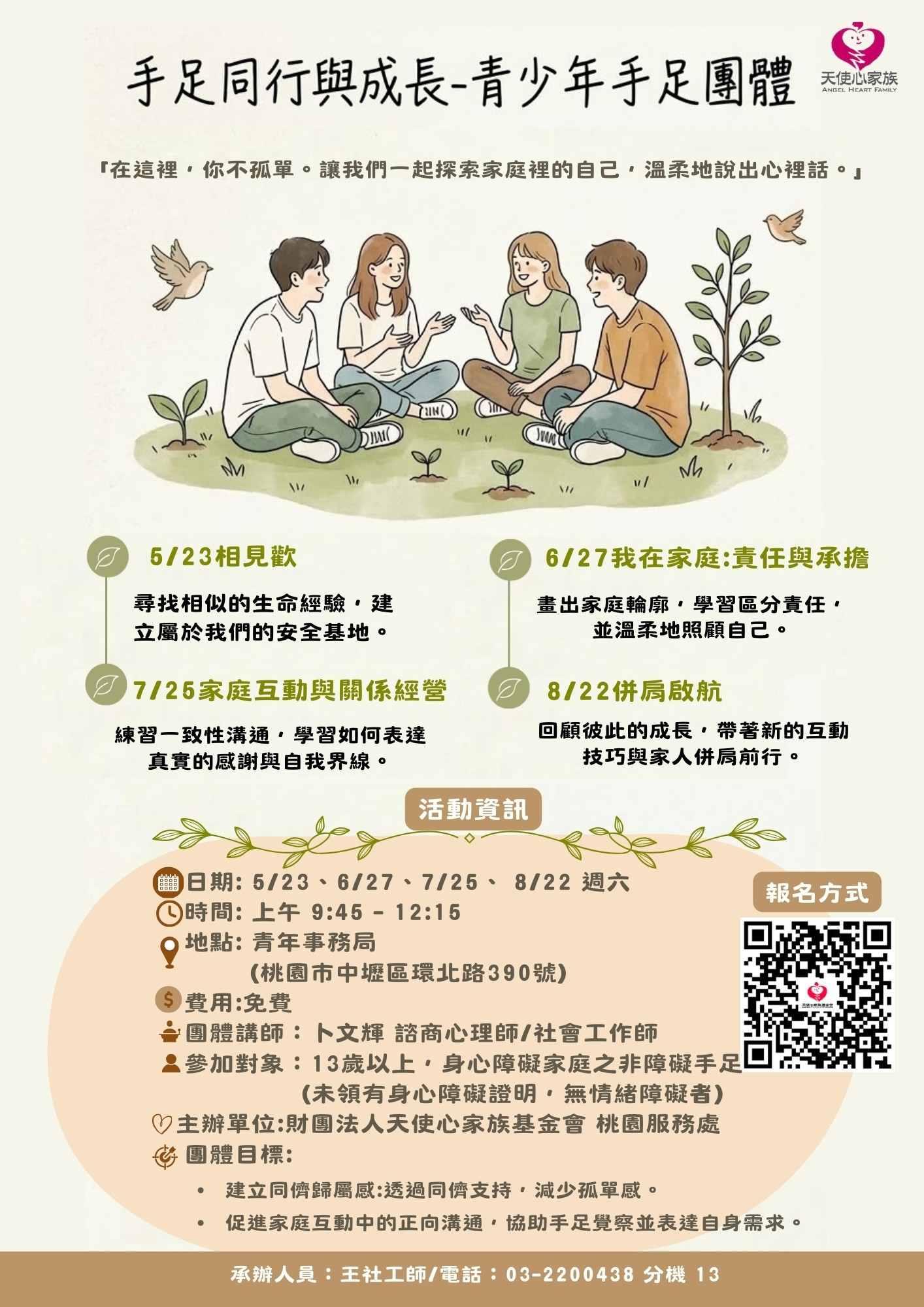 你也是那個從小懂事、默默付出的手足嗎?在家庭中,你的心聲也值得被溫柔聽見。讓我們一同經歷四次團體,在安全基地裡,探索家庭互動,習得自我照顧與溝通技巧,並找到懂你的同儕夥伴。