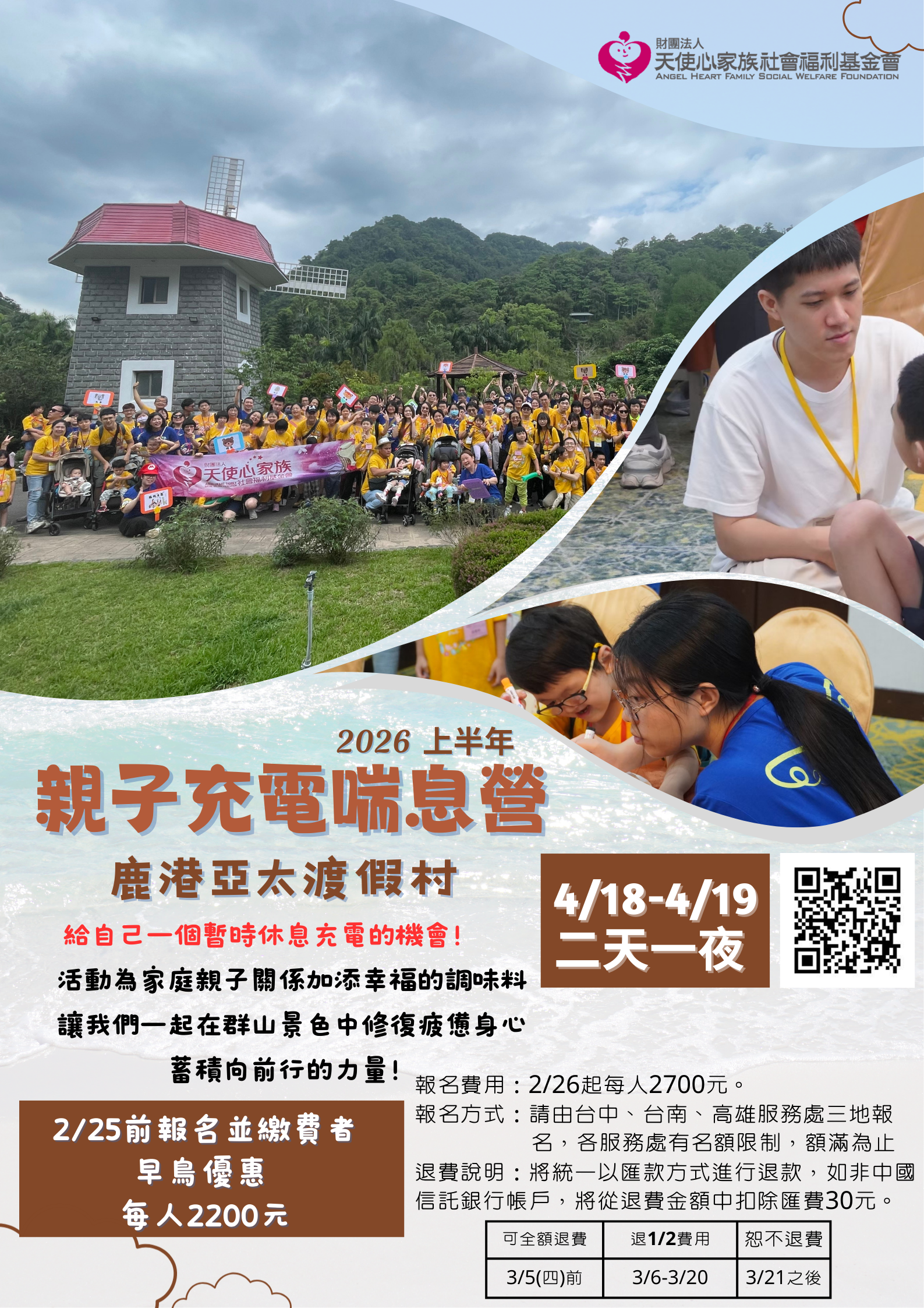*活出健康,讓家不一樣! 天使心家族<親子充電喘息營>開始報名了,歡迎未曾參加過喘息營的愛奇兒家庭報名,本次在<鹿港亞太渡假村>舉辦。