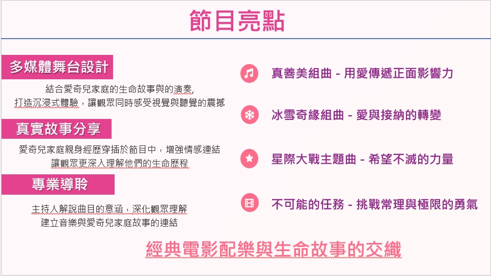 今年,首次與長榮交響樂團攜手合作,結合藝術與慈善的力量,為這場音樂會帶來全新感受,當磅礴的配樂和溫暖的旋律陸續響起,您將感受到愛奇兒家庭完整的心路歷程變化,每一個音符都承載著真實的故事,每一段旋律都訴說著愛的力量如何創造奇蹟