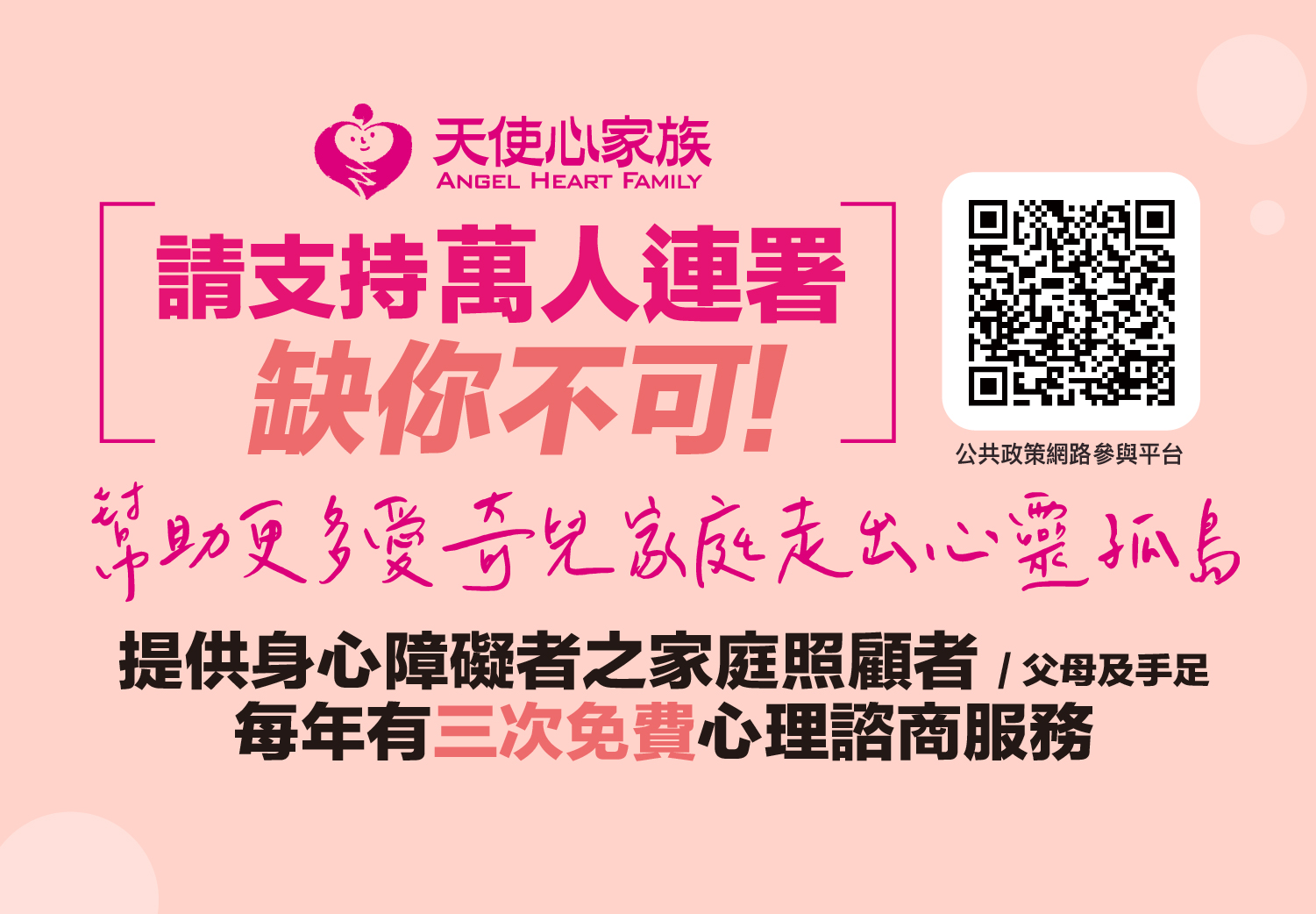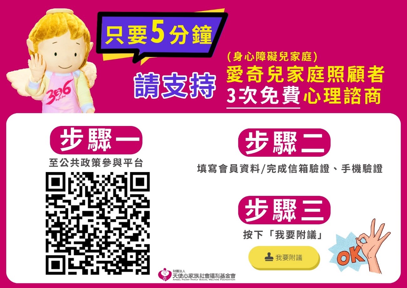 【重要公告】萬人簽署支持~提供身心障礙者之家庭照顧者每年有三次免費心理諮商服務