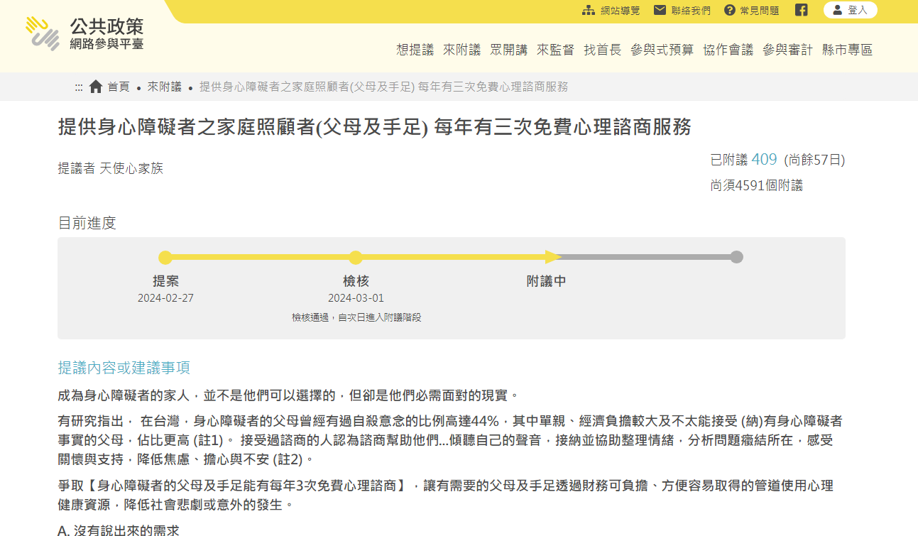 身心障礙者家庭照顧者每年3次免費心理諮商連署提案